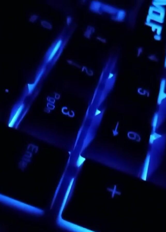 In a dimly lit setting, a partial view of a black keyboard with blue, green, and red backlighting is visible