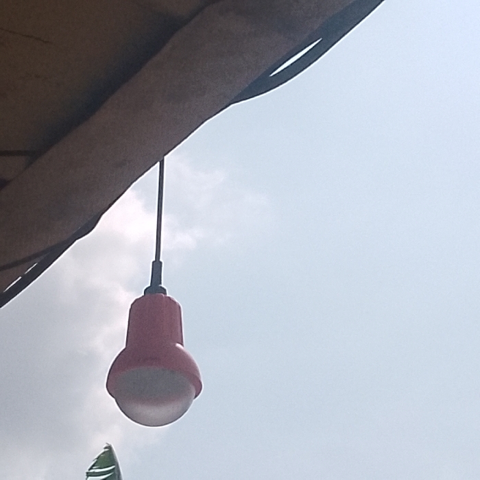 The image displays a reddish-orange pendant light fixture with a translucent white globe, suspended by a black electrical cord. The fixture hangs from a brown, textured overhang, visible in the upper left quadrant, which appears to be constructed of wood or concrete. The background consists of a bright, predominantly clear sky with minimal white cloud formations, indicating an outdoor daytime setting. A small portion of a green leaf is visible at the bottom left edge of the frame. No individuals are present. This scene is located in Madalla, Nigeria.