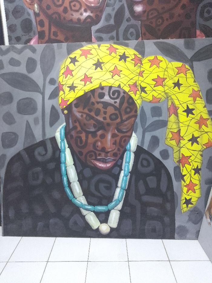 - "The image displays a photograph taken in Ikate, Nigeria, showcasing a vibrant portrait painting positioned upright on a white tiled floor with grey grout lines" by FM-aUq7B2, licensed under CC BY 4.0
