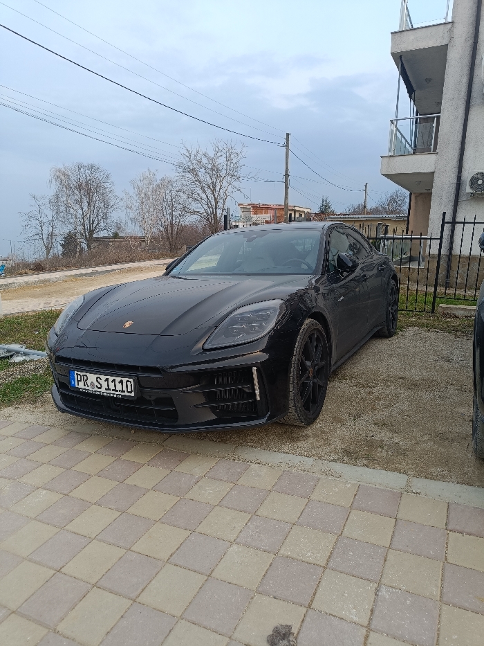 The image displays a black Porsche Panamera parked on a gravel patch in a residential area of Byala, Bulgaria