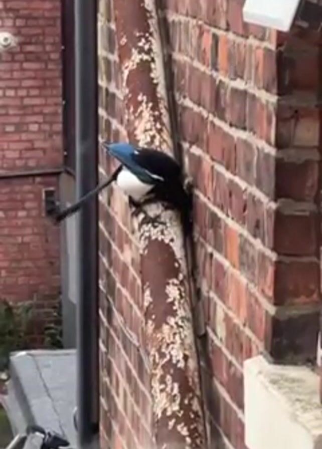 The camera shows a magpie perched on an old, rusty metal pipe attached to a red brick wall