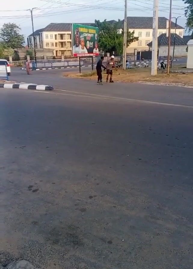 The scene captures a street view in what appears to be a suburban or urban area, likely in a country within Africa. The environment includes a paved road marked with a pedestrian crossing, a billboard, buildings, streetlights, trees, and power lines overhead. The main action involves two individuals on roller skates, moving across the road. One is dressed in dark clothing, while the other wears a light-colored shirt and shorts. A woman in a green burqa walks across the road carrying a large pot on her head. There's also a parked white car visible in the background. Other figures can be seen walking near the road, adding to the sense of everyday street activity. The billboard in the background is displaying a political advertisement. The lighting suggests that it is daytime, possibly early morning or late afternoon.