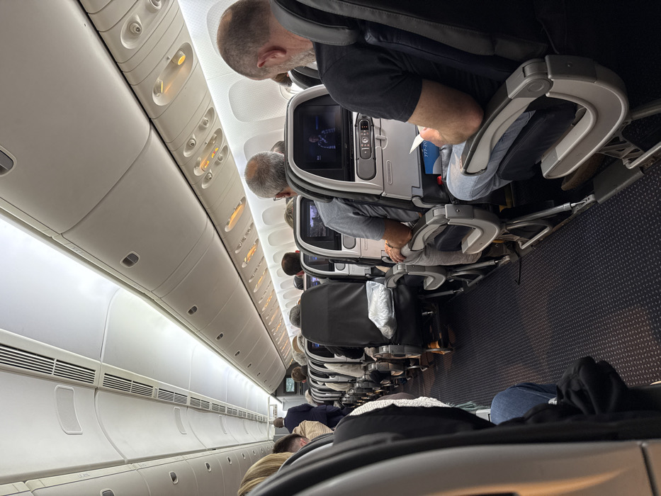 interior of a commercial airplane, viewed from the perspective of a passenger seated on the left side of the aisle