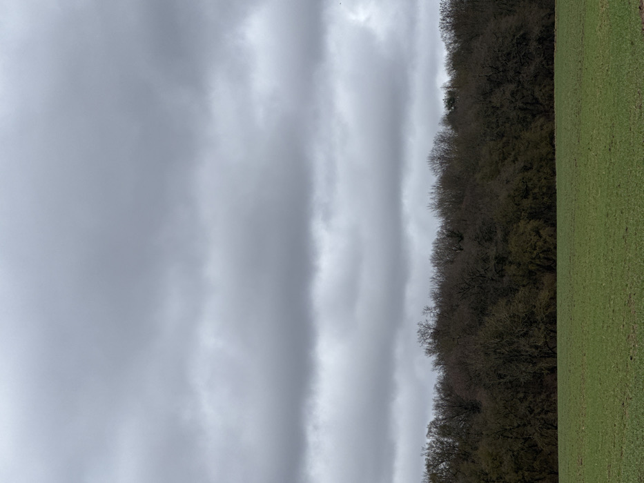 The image depicts a rural landscape in Echzell, Germany. The scene is dominated by a heavily overcast sky, characterized by multiple layers of grey clouds occupying approximately the upper two-thirds of the frame. Below the sky, a dense treeline extends horizontally across the entire width of the image. These trees are largely bare of foliage, suggesting a late autumn, winter, or early spring season. The lowest third of the image shows an expanse of green ground, indicative of a field or pasture with short vegetation. No individuals, animals, or human structures are visible, and no actions or interactions are occurring.