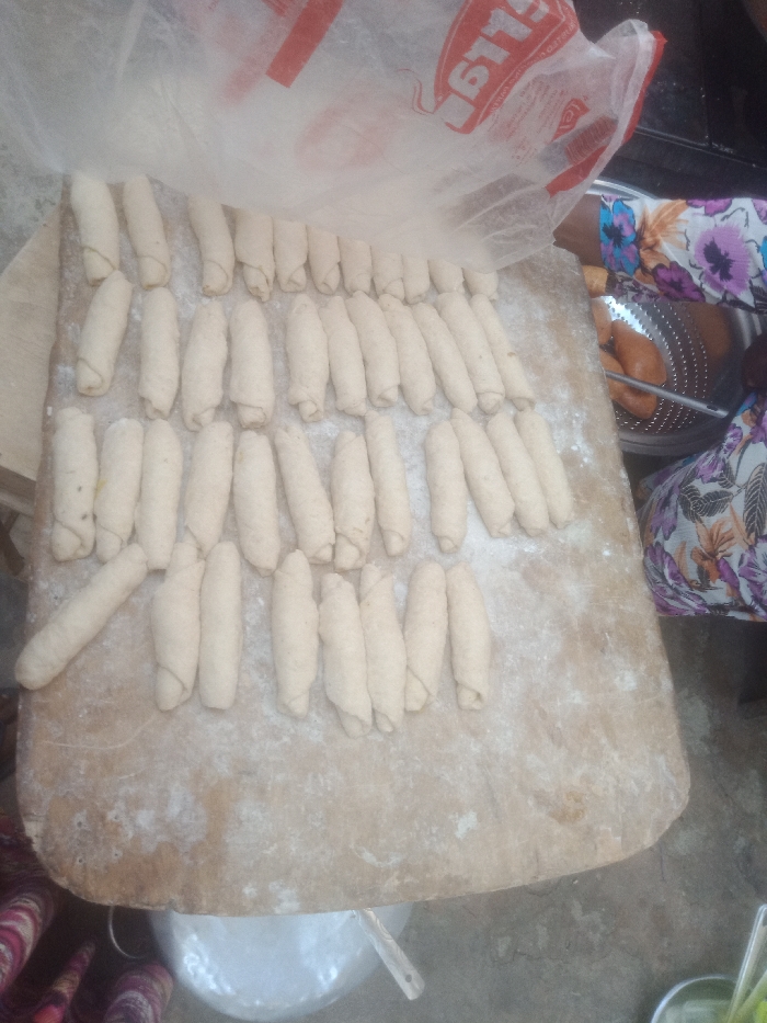 In Hotoro North, Nigeria, a cooking scene unfolds, centered on a large, light brown wooden surface, approximately 60x80 cm, dusted with flour. Neatly arranged on this surface are 50-60 elongated, raw dough pieces, each roughly 10-15 cm long and light beige, indicative of preparations for frying. A clear plastic bag with inverted red lettering hangs over the top left of the wooden board. To the right, an individual is partially visible, wearing a long-sleeved, floral-patterned garment in shades of purple, white, orange, and green. Their right hand holds a metal slotted spoon, which is immersed in a dark metal bowl containing several freshly fried, golden-brown food items, cylindrical in shape, suggesting they are the cooked version of the dough pieces. A large, reflective metal pot is partially visible on the floor beneath the wooden surface in the lower center, with the light gray floor also visible in the background.