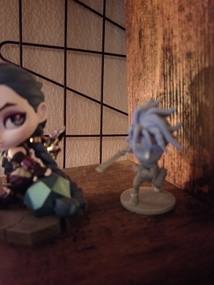 Two figures stand on a wooden surface. The figure on the left is a stylized female with dark hair, purple eye shadow, and a dark patterned outfit with green accents. To the right, a monochrome blue figurine with spiky hair is poised with an arm extended. A black grid structure is visible in the background, with a textured wooden wall on the far right. The lighting is soft, casting shadows that partially obscure the scene.