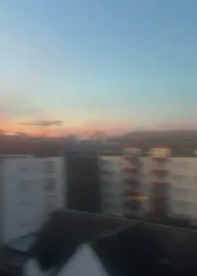 cityscape under a vibrant sunset, with buildings of varying heights and architectural styles dominating the foreground. The sky transitions from a bright blue at the top to pink and orange hues near the horizon. A construction crane stands in the distance. The video appears to be shot from an elevated position, possibly a rooftop or high-story building. A large number of birds are lined up on the crane's boom.
