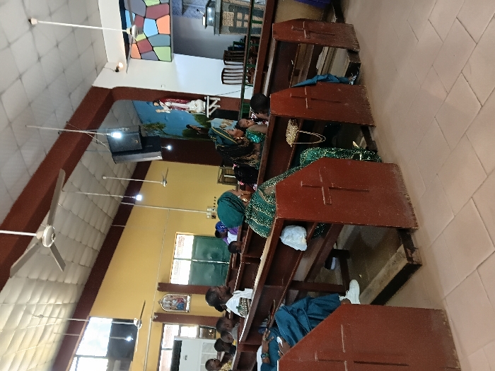People sit in church pews with backs adorned with crosses. The pews are arranged in rows. Religious paintings and stained glass decorate the walls. Ceiling fans hang overhead. A television screen is mounted high on the wall. The scene appears to be a church service or religious gathering.