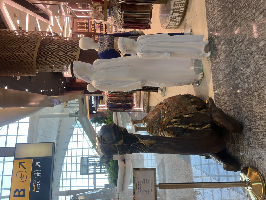 This image depicts an interior scene within an airport terminal located in Al Matar, United Arab Emirates. In the foreground, to the left, a large, dark bronze-colored statue of a sitting camel is positioned on a mottled gray and white tiled floor. The camel is adorned with gold-colored decorative elements, including a saddle and hanging tassels. Adjacent to the camel statue, on its left, a gold-colored stand holds a white informational sign. The sign details the statue as a "SITTING CAMEL" made of "BRASS MATERIAL," with a weight of "280kg," length of "234cm," height of "185cm," width of "71cm," and a price of "AED 9,390.00." To the right of the camel statue, a retail display area is visible, featuring three white mannequins. The tallest mannequin, positioned centrally, is dressed in a traditional white thobe, a white ghutra, and a black agal. To its right, a child-sized mannequin wears a white thobe and a white head wrap. Behind the child mannequin, a female mannequin is dressed in a long, dark blue garment with gold patterning and a light-colored belt. Clothing racks displaying various garments are present in the retail space, along with shelving units holding merchandise. The store features a decorative, gold-colored column with geometric patterns. The background reveals the modern architecture of the airport terminal, characterized by expansive glass walls, a high ceiling with structural beams, and bright natural light. A prominent yellow and black sign is visible on the left, displaying an uppercase "B" alongside an airplane icon pointing right. Below it, a black panel indicates "Lifts" (in English and Arabic) with an arrow and a stick figure icon pointing right. Further in the background, escalators or moving walkways are visible, along with green planters containing foliage. A partial store name, "MAISON S," can be seen in the distance. The floor throughout the scene is covered in a glossy, patterned gray and white tile.