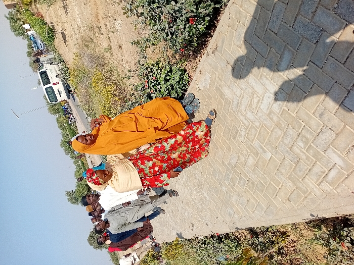 The image displays a group of approximately ten individuals walking along a paved pathway under clear daylight in Kwazailewa, Nigeria