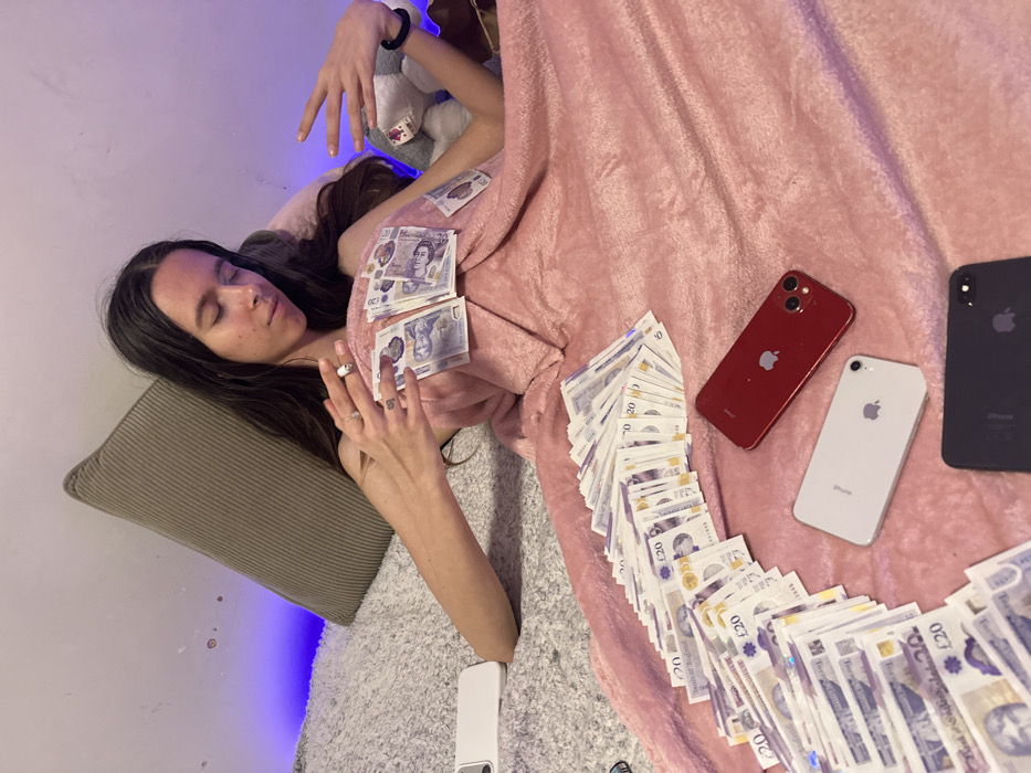 The image portrays a young female subject, estimated to be in her late teens or early twenties, reclining on a pink, soft-textured blanket or throw. The scene is situated indoors, within a private residence in Corby, United Kingdom. She possesses long, dark hair. Her left hand, adorned with rings and a small dark tattoo, holds a lit cigarette between the index and middle fingers. Her right hand is raised with fingers splayed. A substantial quantity of £20 sterling banknotes is distributed across the pink blanket and on the subject's torso, arranged in various stacks and fanned-out configurations. Three Apple iPhone smartphones are present on the blanket: one red, one white, and one dark grey/black. An additional white smartphone is partially visible on a grey, fluffy surface to the immediate left of the subject. A large, ribbed, beige-colored cushion supports the subject's head. The background consists of a white wall exhibiting minor discoloration or marks, with a horizontal blue ambient light source positioned along the lower section of the wall on the left. A white plush toy is partially visible behind the subject's right arm.
