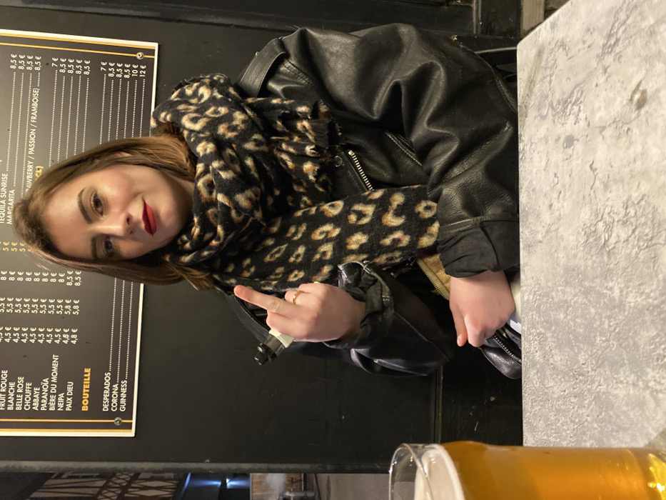 A young woman in a black leather jacket and leopard-print scarf sits at a table next to a menu. The menu lists various beverages like "FRUIT ROUGE" and "TEQUILA SUNRISE" with their prices in Euros. A glass of beer sits on the table. She is holding up her middle finger. The backdrop includes a dark, possibly indoor, setting.