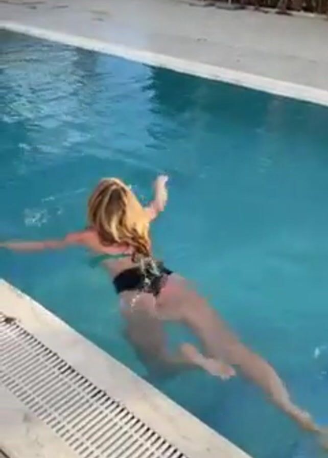 A woman in a black bathing suit is swimming in a rectangular, light blue pool. The pool is surrounded by a light-colored stone patio, with a drainage grate along one side. Green foliage and a light stone wall are visible in the background. The woman swims away from the camera, then turns her head back to look at it. She continues swimming away. The camera remains stationary throughout the video.