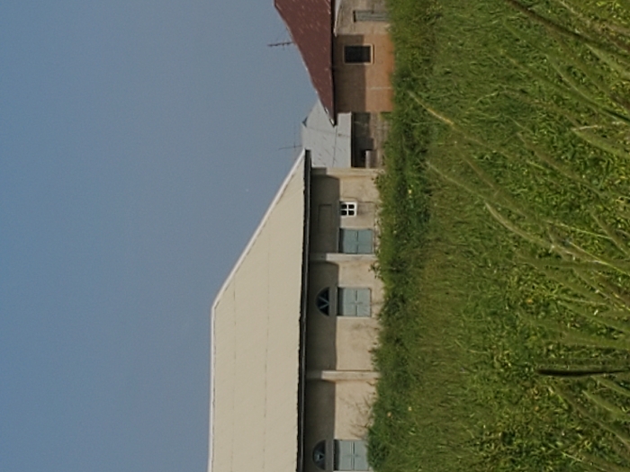 The scene, located in the city of Unknown, Unknown, presents two buildings partially obscured by dense, tall green vegetation covering the lower and central foreground. On the left, a single-story, light beige building with a light-colored metal gabled roof features four windows on its visible facade. Three windows are fitted with light blue closed shutters; two are arched, and one is rectangular. The fourth window, smaller and square, is open with a dark interior. To the right and slightly behind, a smaller, earthen-toned building with a reddish-brown gabled roof is partially visible, showing a single rectangular window opening and a door opening. The background consists of a clear, bright blue sky. No individuals, vehicles, or active elements are present in the image.