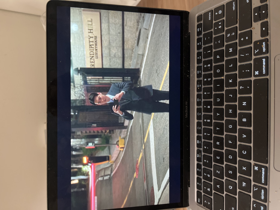 A MacBook Air laptop displays a scene from a show or movie. The screen shows a man in a suit standing on a street corner in front of a building with "Rendipity Hill Luxuryhouse" displayed. The keyboard of the MacBook is dusty and shows typical key arrangements. The laptop is on a light-colored surface.