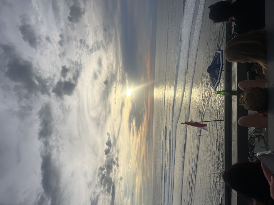 The image depicts a sunset over the ocean from an elevated coastal vantage point in Uluwatu, Indonesia. The sky is largely overcast with scattered dark and light grey clouds, displaying hues of orange and yellow near the horizon. The sun is a bright, radiating orb positioned centrally on the horizon, casting a reflective path of light across the ocean surface. Multiple parallel waves are visible, with two small, silhouetted figures, likely surfers, discernible in the water. In the mid-ground, below the primary viewing level, an Indonesian flag (red and white horizontal stripes) is flown on a pole. Below it, a blue and white umbrella, partially open, bears the text "Island Brewing Co." The foreground features a dark, horizontal railing or table structure, behind which four individuals are observed from behind, seated or leaning, facing the ocean. From left to right: 1. A person with long dark hair, holding a white smartphone in their left hand. 2. A person with visible bare legs propped on the railing and light-colored hair, looking forward. 3. A person with long, lighter-colored hair and fair skin, turned slightly to their right. 4. A person with dark hair, also facing the ocean. A green glass bottle, consistent with a beer bottle, stands on the railing between the second and third individuals from the left. The overall scene conveys a relaxed atmosphere during sunset.
