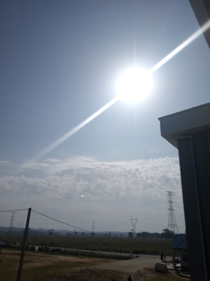The image depicts an outdoor scene under bright daylight in the city of Unknown, Unknown. The sun, a brilliant white orb with prominent lens flare, is situated in the upper right quadrant of a clear blue sky, partially obscured by scattered, textured cumulus clouds extending across the mid-sky. In the foreground, an unpaved dirt path curves from the lower center towards the right. A single dark figure walks on this path in the lower-center. Towards the far right, a small group of two to three dark figures stands or walks near a compact, single-story building with a blue corrugated metal roof. A large, light-colored rock or concrete block rests beside the path to the right of center. On the far left, a dark vertical pole with a horizontal wire is visible. The midground features an expansive, flat, open field, predominantly green and brown, stretching towards a distant treeline or low hills. Multiple high-voltage lattice-style power line towers are scattered across the horizon in the midground, with one prominent tower on the far right, another near the center-left, and a smaller one on the far left. The upper right portion of the frame is cut by the corner of a modern building, revealing a light grey facade and a darker grey vertical element, with its roofline visible against the bright sky.