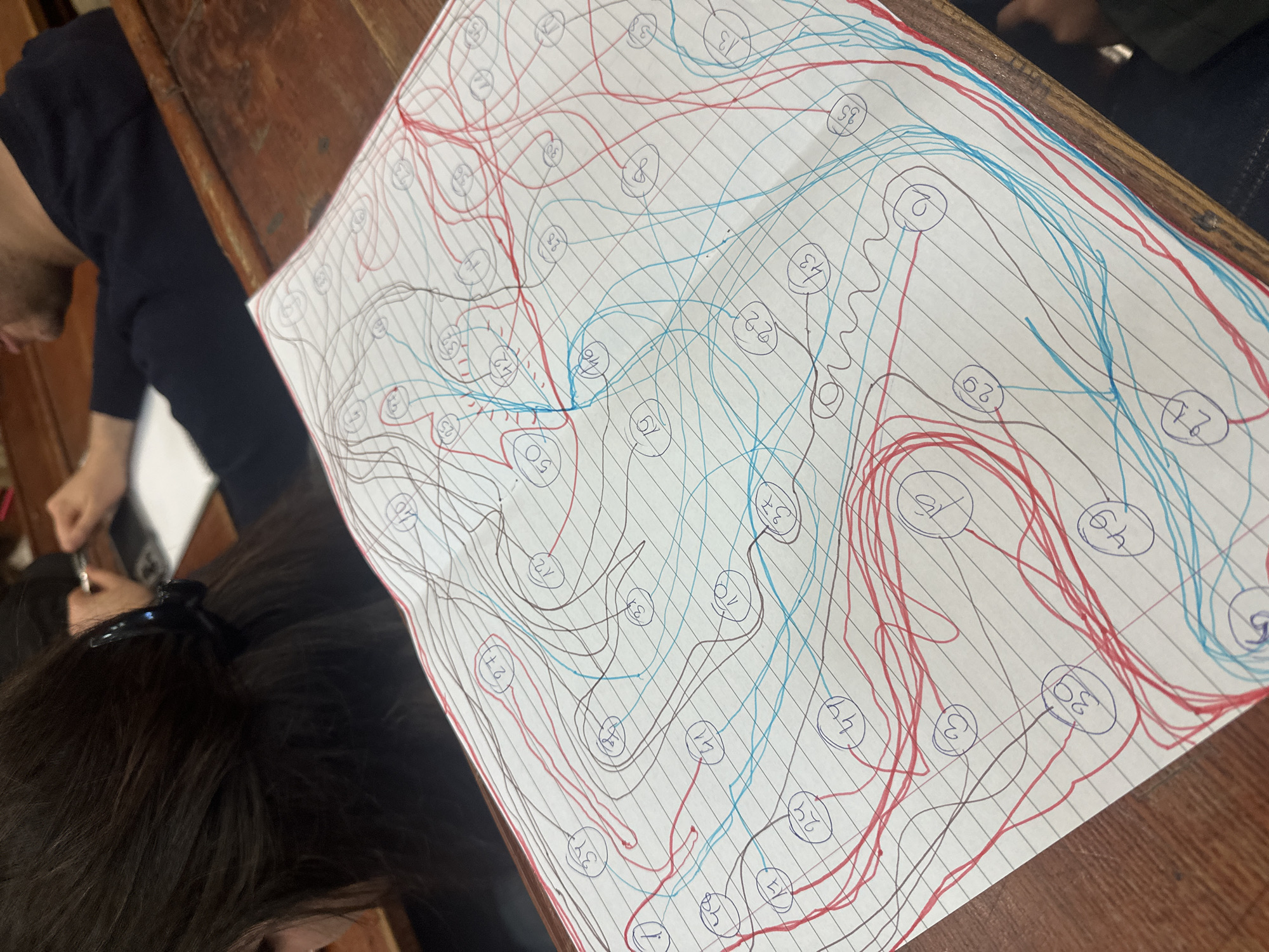 sheet of lined paper filled with a complex network of interconnected circles labeled with numbers