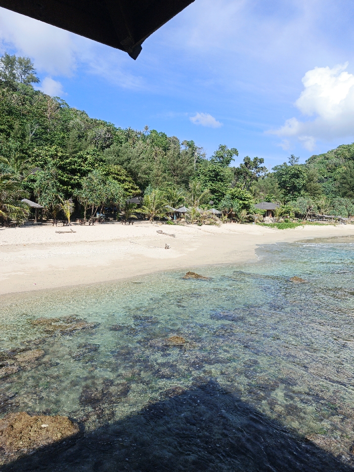The image presents a static, uninhabited tropical beach scene in Meunasahbale, Indonesia, under a bright blue sky with scattered white cumulus clouds. A dark, angled architectural overhang partially frames the top of the frame. In the foreground, clear, shallow turquoise ocean water is visible, revealing an active seabed of dark rocks and coral formations. A light-colored sandy beach extends from the water's edge towards a dense, verdant tropical hillside that forms the background. Along the beach, multiple structures are positioned: several open-sided shelters with thatched roofs, beneath which wooden picnic tables and benches are arranged. Additional individual wooden bungalows or cabins with darker roofs are nestled among the trees closer to the hillside. Several pieces of light-colored driftwood are present on the sand. No individuals or active subjects are depicted within the scene.