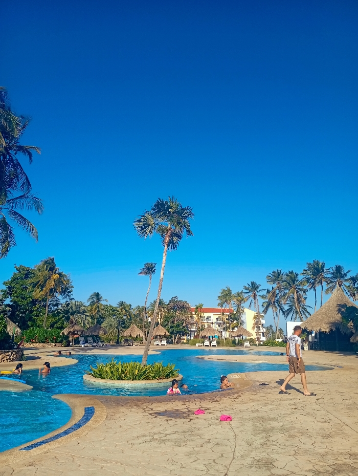 A sunny day at a tropical resort reveals a large, winding swimming pool. Several people are enjoying the water, including children and adults. A man walks along the pool's edge. Palm trees surround the area, with thatched-roof structures providing shade. A building with balconies is visible in the background under a bright blue sky. Pink sandals sit by the pool's edge.