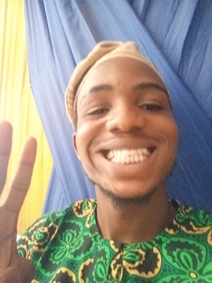 male individual, likely an adult, from the chest up. He has a dark complexion, a short beard, and is wearing a light beige skullcap. The individual is smiling broadly, displaying both upper and lower teeth, and looking directly at the camera. His left hand is raised on the left side of the frame, forming a V-sign with two extended fingers. He wears a green garment with black and yellow patterned designs. The background consists of draped fabric, primarily blue, with a section of yellow fabric visible to the individual's left. The environment appears to be indoors. The location is Unknown, Unknown.