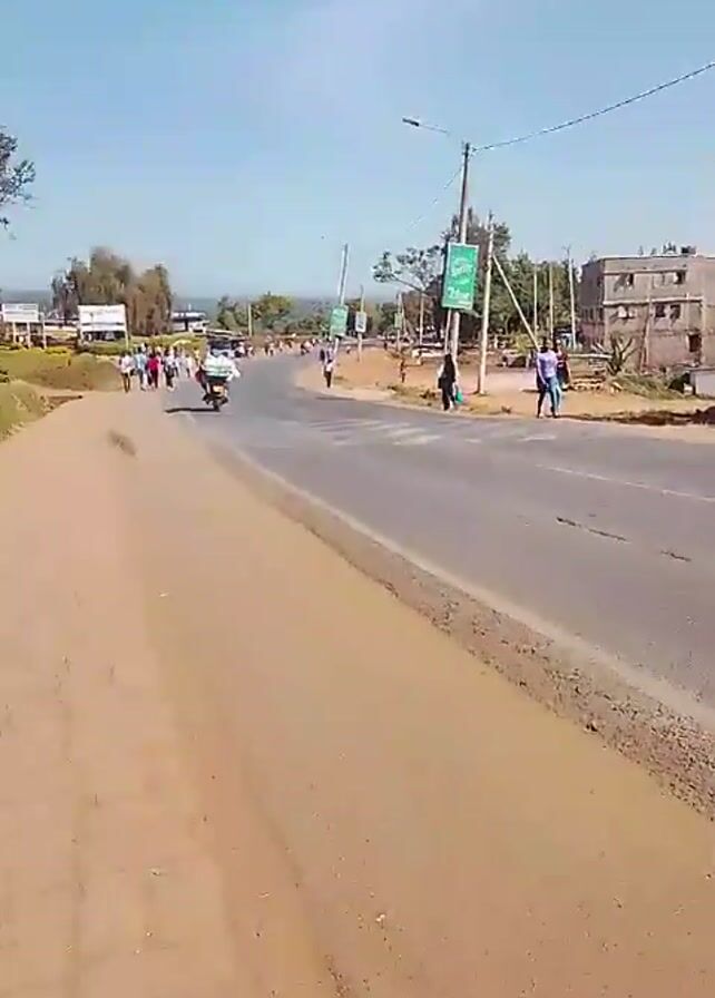 A person is walking down a sidewalk next to a road in what appears to be a residential area. The road has a few vehicles and pedestrians, including a motorcycle. The sidewalk has grass and bushes lining it. There are buildings in the background. The sky is blue.
