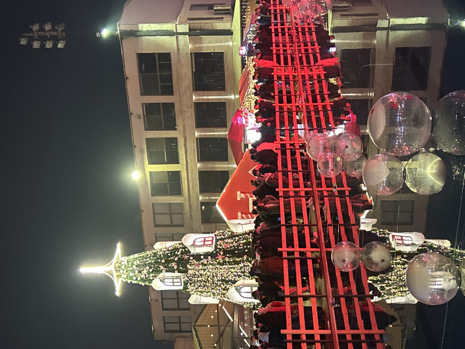A tilted perspective shows a Christmas tree with a star on top, situated in front of a tall building with lit windows