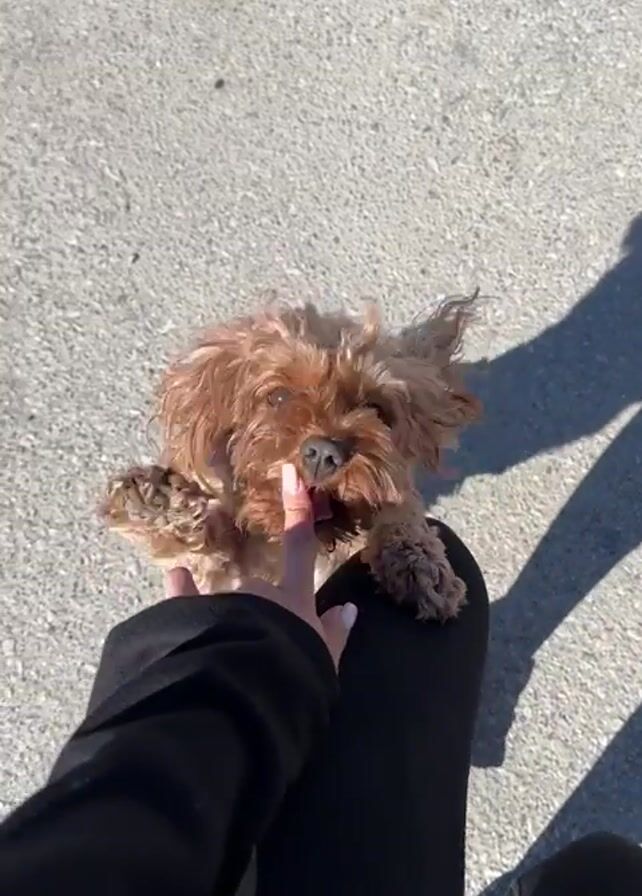 A video shows a person petting a small, light brown dog with curly fur. The dog sits on the person's lap, who wears black leggings and a black sweatshirt. The person's hand, with light pink nail polish, gently touches the dog's nose and forehead. The scene takes place outdoors on a gray concrete surface, with the shadow of the person standing and holding the camera visible next to them. The lighting is bright and sunny.