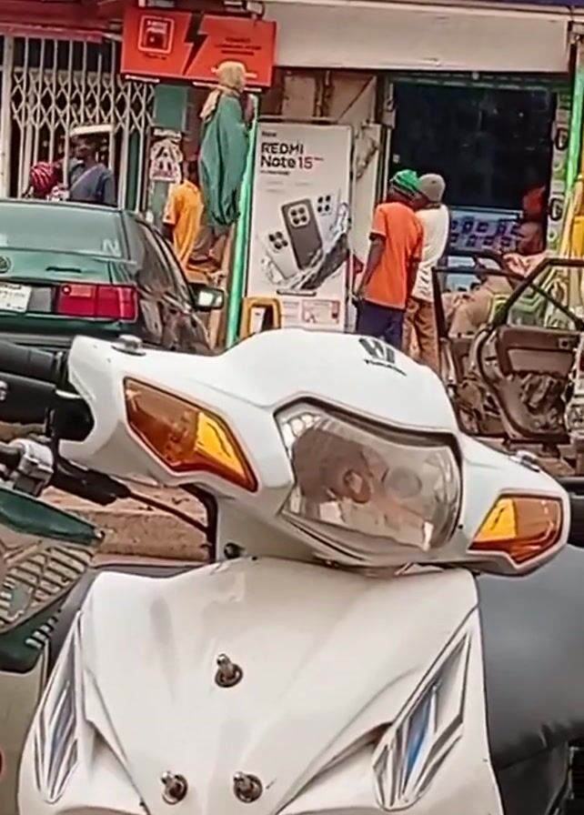 street scene with a white motorcycle parked in the foreground. Behind the motorcycle, people are seen walking and standing in front of a store. A person wearing a green garment is on a ladder. Several cars pass by in the background. The store has a sign advertising various electronic devices and repairs. The overall scene appears to be a busy street in a commercial area.