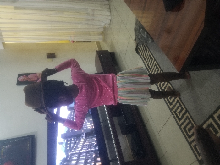 A child wearing a pink polka dot long sleeve shirt and a striped skirt stands in a room. The child is holding a brown hat over their head. In the background, there's a TV displaying an image of city skyscrapers. The floor is tiled and features a patterned rug with Greek key designs. A wooden table is also partially visible. The room is lit by natural light filtering through white curtains. A framed artwork hangs on the wall behind the child.