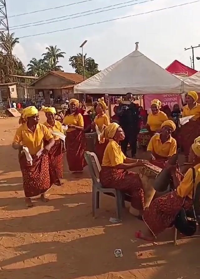 group of people dressed in matching yellow shirts and patterned red and brown skirts at an outdoor event. Most of them are women wearing yellow headscarves. Some women are sitting on chairs and playing drums. A few women are dancing. A man in a black suit walks among them. In the background, there are tents, buildings, a tall metal structure, and trees. The ground appears to be dirt or sand. The video seems to be taken with a mobile phone camera.