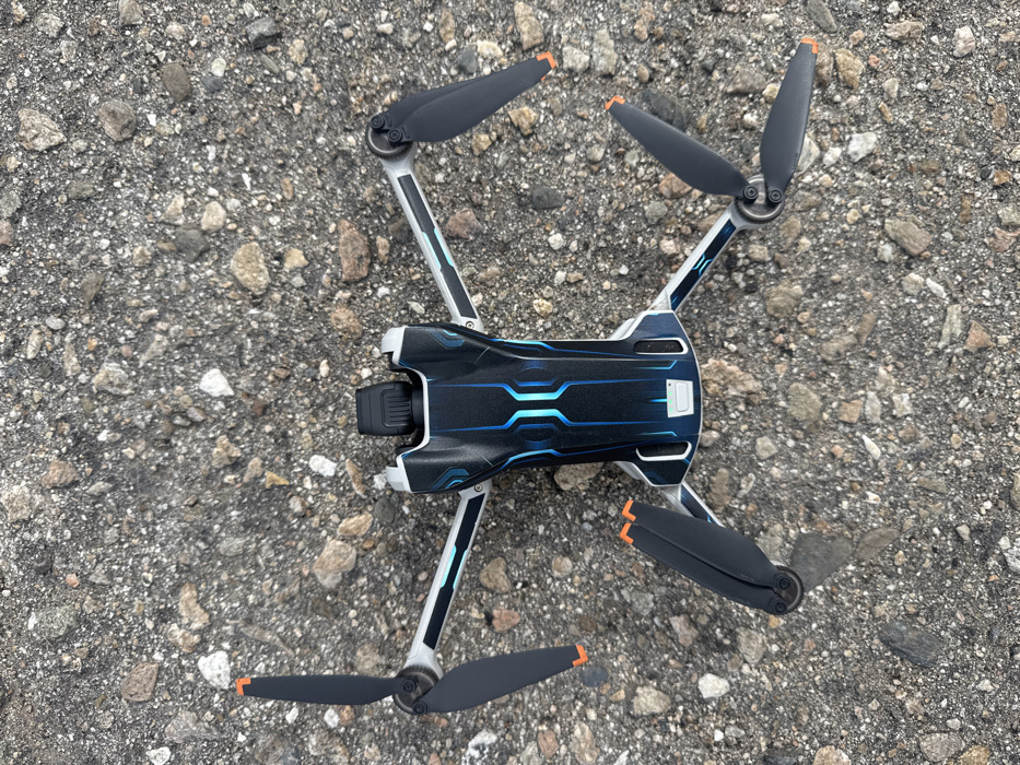 In Moskovets, Bulgaria, a grey and black DJI Mavic 3 series drone is depicted resting on a coarse gravel and soil surface. The drone's main body features a custom adhesive decal with bright blue geometric patterns against a dark background. Its four arms are extended, each equipped with two black propellers, all featuring orange tips. A camera gimbal is visible at the front of the drone. The drone appears intact with no visible damage. The ground beneath consists of various shades of grey and brown pebbles, gravel, and dirt. No individuals, other subjects, or specific actions are observed in the scene.