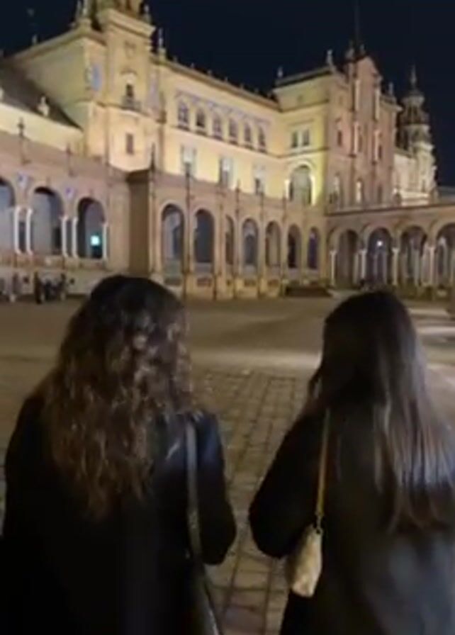 Two women, seen from the back, walk hand in hand across a large paved square at night. Both are wearing dark coats. The woman on the left has long, wavy brown hair and carries a dark purse. The woman on the right has long, straight brown hair and carries a light-colored purse. In the background is a large, ornate building with towers and arched windows. The building is illuminated, casting a warm glow on the square. At one point, the woman on the left holds up her phone.