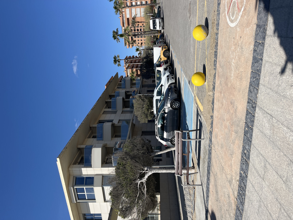 scene in Alboraia, Spain, at the coordinates 39.487, -0.325. There is a modern apartment building with a parking lot in front of it. Several parked cars are visible in the lot. There is a bench in the foreground, and two yellow bollards are in the parking lot. The sky is blue and clear. There is a small tree in the foreground on the left side of the image. There are other buildings visible in the distance to the right of the image, and a few palm trees.