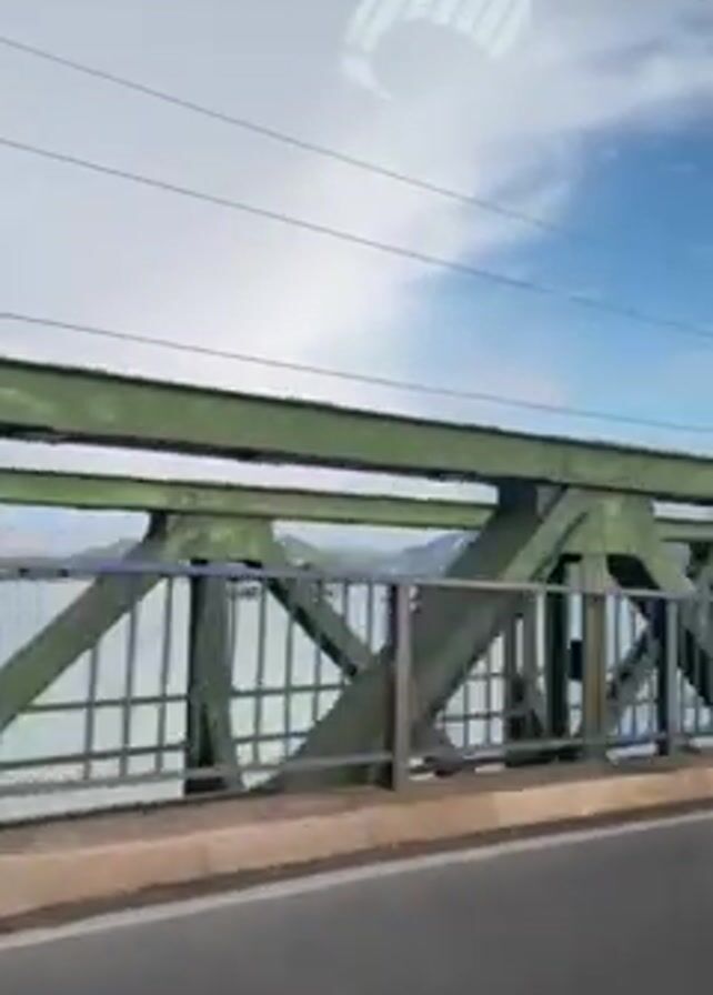 view from a car crossing a green steel bridge