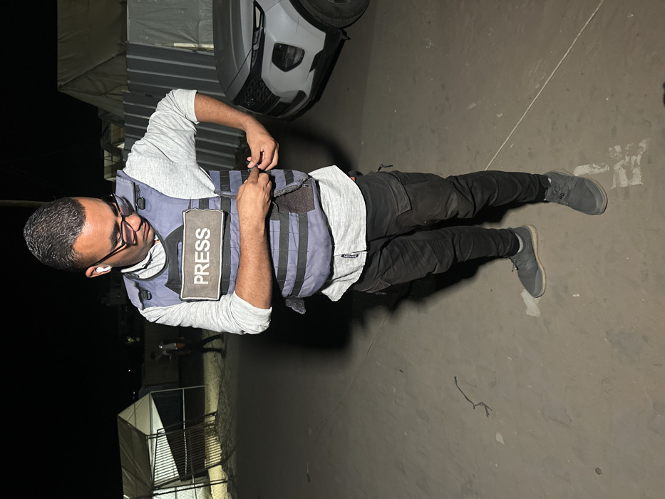 A male individual is depicted at night, standing outdoors in what appears to be Al-Mawasi. He is wearing a grey long-sleeved shirt, black cargo pants, grey athletic shoes, dark-rimmed glasses, and white wireless earbuds. He is actively fastening a blue-grey ballistic vest that displays a prominent white "PRESS" patch on the chest. The ground is a light-colored, possibly paved or compacted dirt surface. The background features several white tent structures and a distant figure to the left, while the front of a light-colored SUV is parked next to a dark corrugated barrier on the right. The scene is illuminated by artificial light.