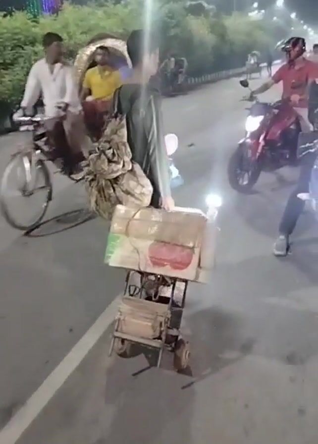 A young man with a backpack stands on a street at night, facing away from the camera. He is next to a small, homemade-looking vehicle with a box on top. The vehicle has small wheels and appears to be powered by a motor. There are people on motorcycles and in a rickshaw passing by. The street is lit by streetlights and some decorative lights in the background. Some people are walking in the distance.