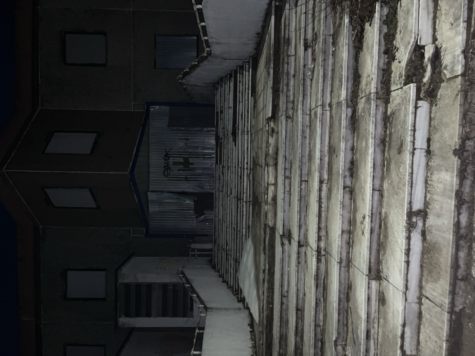 building in the city of Марковский, Russia, viewed from an elevated angle. The building appears to be constructed of concrete. A long wall with many vertical sections runs along the right side of the image, and the left side of the image shows a dark building with several windows. A metal structure with graffiti is visible between the two buildings. There is debris and foliage near the building and on the wall. The image appears to have been taken at night or in low light.