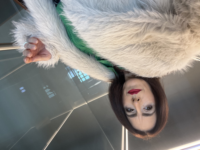 A single female subject, with medium-length dark brown hair, fair complexion, and red lipstick, is depicted in an indoor environment in Mensdorf, Luxembourg. She is positioned from a low angle, gazing directly into the camera. She wears a light beige, shaggy faux fur coat, under which a bright green garment is visible. Her left hand is partially exposed, revealing a silver ring on the ring finger and a faint circular tattoo on the side of the middle finger. The background features reflective grey architectural panels with distinct linear lighting elements and reflections of multiple rectangular light sources, suggesting a modern interior space.