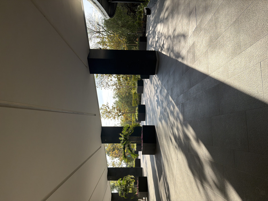 - "An outdoor corridor features a repeating pattern of black columns interspersed with planter boxes holding small palm trees" by FM-2d4mA3, licensed under CC BY 4.0
