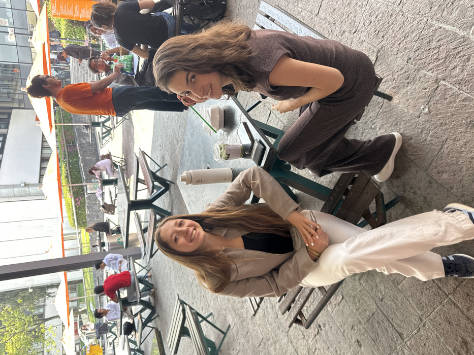 Two young women pose at a table on an outdoor patio. The woman seated is fair-skinned with long brown hair and wears a brown two-piece outfit and white sneakers. The second woman sits adjacent to the first, her blond hair cascading down, with a neutral-toned blazer, black top, white pants, and blue sneakers. A metal water bottle sits on the table between them. Other people are visible in the background, seated at similar tables.