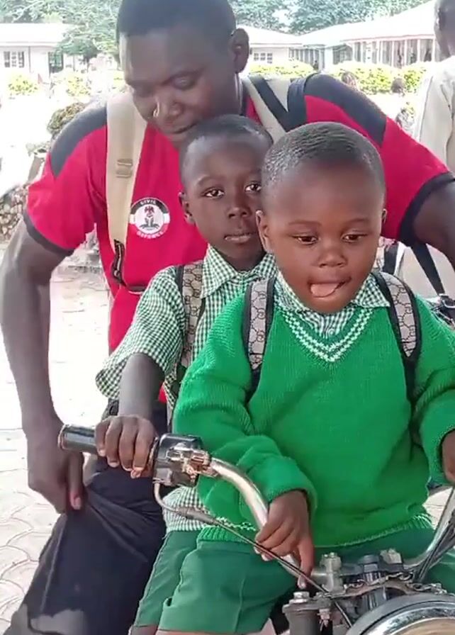 A man is sitting on a motorcycle, facing forward and looking at the camera, with two young children sitting in front of him on the motorcycle. All three individuals are looking at the camera. The man wears a red and black shirt, and black pants. The children are wearing school uniforms with backpacks. The child in the front is wearing a green sweater, and the child in the back wears a green and white plaid shirt. The motorcycle appears to be stationary. In the background, there are buildings and people.