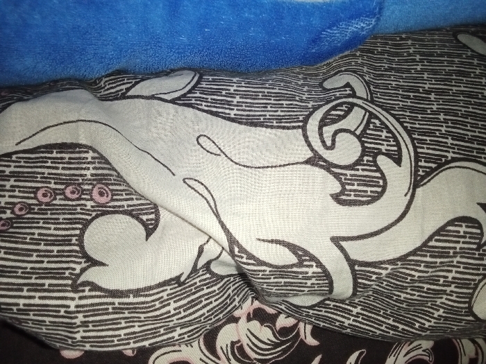 The image displays a close-up view of layered textile materials. The upper portion features a solid blue, textured fabric, consistent with a fleece or similar soft material, exhibiting gentle folds. Below this, the primary subject is a patterned fabric with a light grey base interwoven with dense, horizontal dark brown dashed lines, creating a textured background effect. Superimposed on this background are large, abstract, swirling organic motifs, also in light grey but outlined in dark brown, forming a decorative pattern. On the left side of this patterned fabric, several small, pinkish-hued circular elements are visible, arranged in clusters. The fabric is creased and draped, indicating its use as a cover or bedding. A section of a darker, similarly patterned fabric (brown base with light motifs) is partially visible at the bottom of the frame. No individuals, specific actions, or interactions are discernible. The environment is consistent with an indoor setting, likely a bed or sofa. The precise location within Inxuba Yethemba Local Municipality, South Africa, cannot be determined from the visual information provided.
