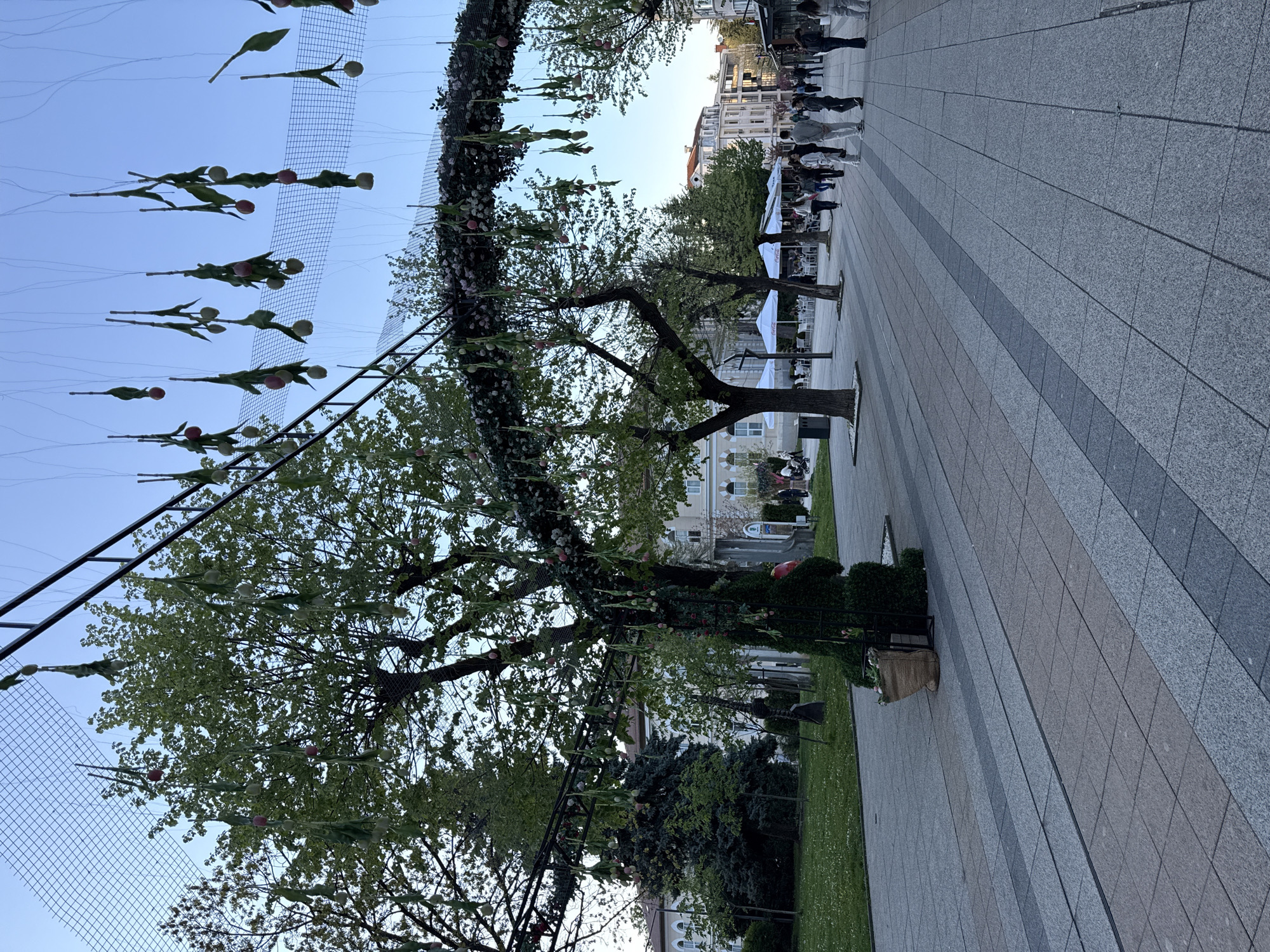 public square in Vratsa, Bulgaria, adorned with a floral archway and suspended decorations. The archway, constructed from metal and netting, is decorated with small white flowers and suspended artificial tulips. A mature tree is integrated into the archway's design. The square is paved with grey stone tiles in alternating shades and patterns. In the background, buildings with architectural details line the square, with blurred figures of pedestrians visible along the edge of the pavement. Some open-air cafes are also present. There's a manicured lawn area visible, with decorative shrubbery and another tree. The sky is pale blue.
