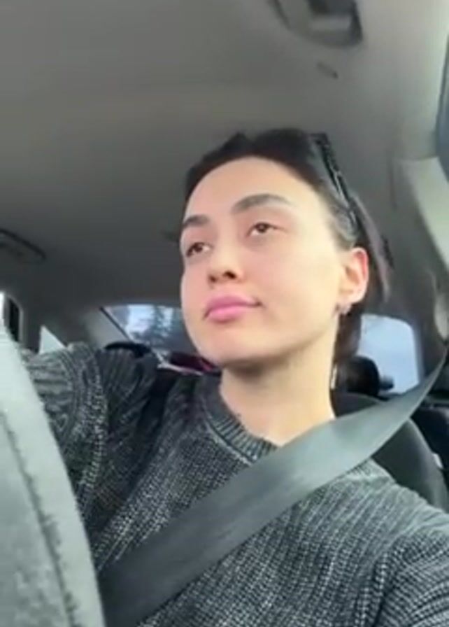 A woman is driving a car while listening to music. The camera is positioned inside the car, facing her. She has dark hair pulled back with a clip and is wearing a grey sweater. She is wearing a seatbelt. The environment outside the car appears to be overcast.