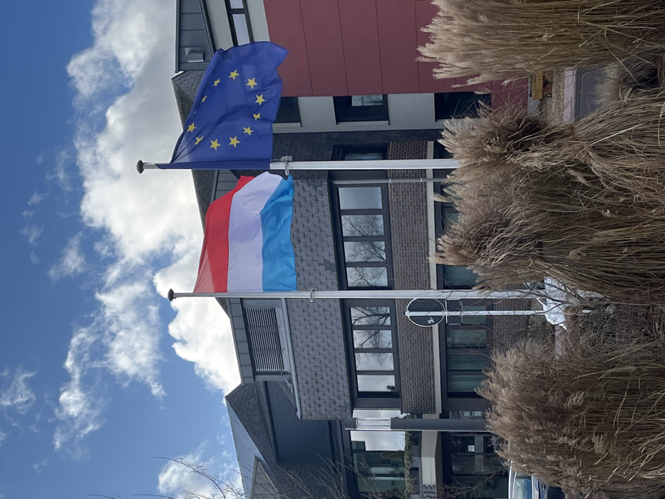 The image displays the exterior of a building in Mondercange, Luxembourg, under a partially cloudy blue sky. In the mid-ground, two flags are flown on separate flagpoles. The flag on the left is the national flag of Luxembourg, characterized by horizontal stripes of red, white, and light blue. The flag on the right is the European Union flag, featuring a circle of twelve yellow stars on a blue field. Both flags are unfurled, indicating wind presence. The background is occupied by a multi-story building. Its left section exhibits a dark gray, possibly shingled or tiled, facade on the upper levels, with a lower section of reddish-brown brickwork. Several rectangular windows on this section reflect bare tree branches and the sky. An entrance area on the far left has a partially visible sign displaying "RIE". Above the windows, horizontal louvered vents are present. To the right, a portion of the building with a flat red facade and white window frames is visible. A white vertical pole with a circular black and white regulatory sign is positioned between the flagpoles and the building's lower windows. The foreground consists of numerous clumps of tall, dried ornamental grasses, which appear light brown or tan. Small patches of white ground cover or snow are visible among the grasses and near the base of the sign pole. No individuals are visible in the scene.