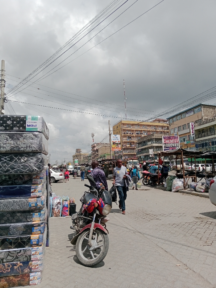 A street scene captures a busy atmosphere under a cloudy sky. A stack of mattresses sits on the left. A red motorcycle is parked near the stack. People walk along the street and among some cars. A pharmacy storefront and several market stalls are visible on the other side of the street. Tall buildings form the backdrop of the busy street. Overhead power lines crisscross above the scene.