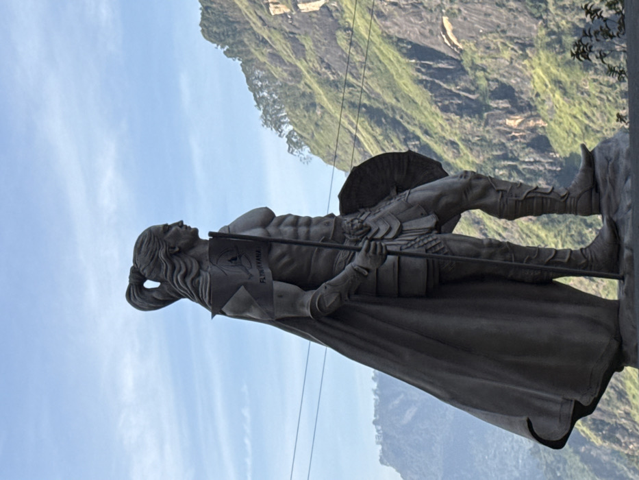 A statue of a muscular warrior stands tall, with a mountain backdrop and a blue sky. The warrior has long hair tied back, holding a flag and shield. The statue is grey and detailed, showing armor and a cape. The setting suggests a high altitude or mountainous region. Power lines are visible in the foreground.