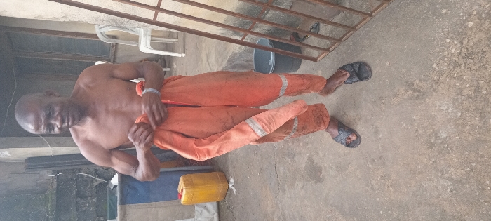 A shirtless man stands outdoors holding bright orange overalls with reflective bands. He wears black sandals and a bracelet on his left wrist. The ground is concrete, with a yellow jerrycan visible near the overalls. A white plastic chair and a metal grate sit in the background, along with a black bucket hanging from the grate. The surrounding area appears to be a yard or outdoor workspace.