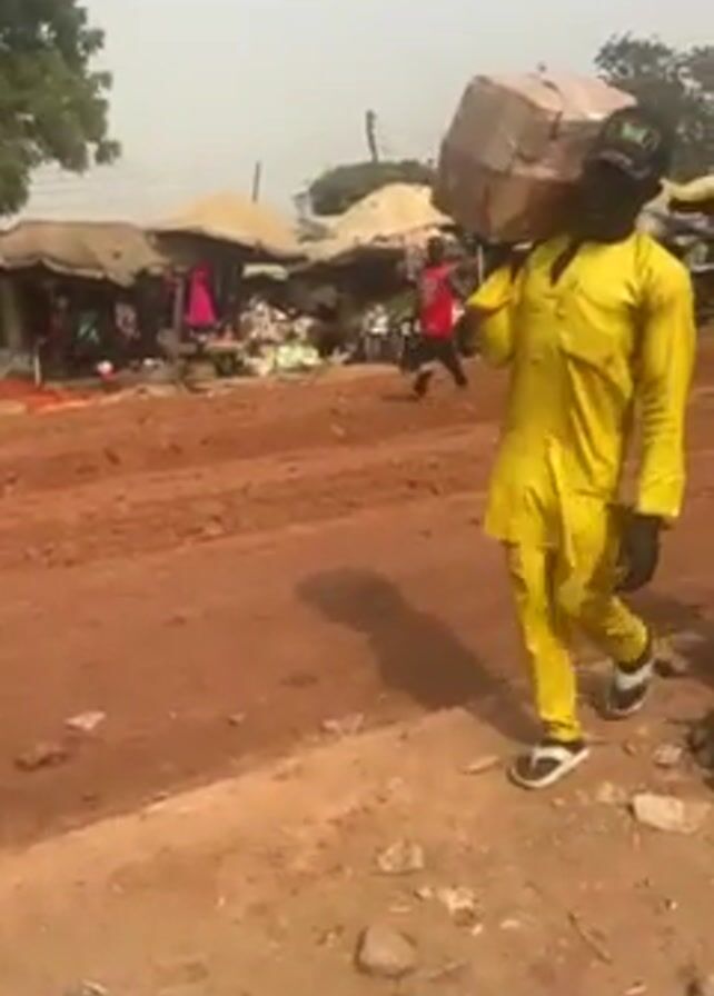 n outdoor marketplace in a developing area. The ground is unpaved and covered in reddish-brown dirt, rutted with tire tracks. A man in a yellow outfit and black cap carries a large cardboard box on his shoulder. He walks past the camera, revealing a view of market stalls with covered awnings. People mill around the stalls, some carrying shopping bags. In the distance, construction equipment, including a yellow bulldozer and a dump truck, are visible. A tall communications tower stands in the background. The weather appears hazy or dusty.
